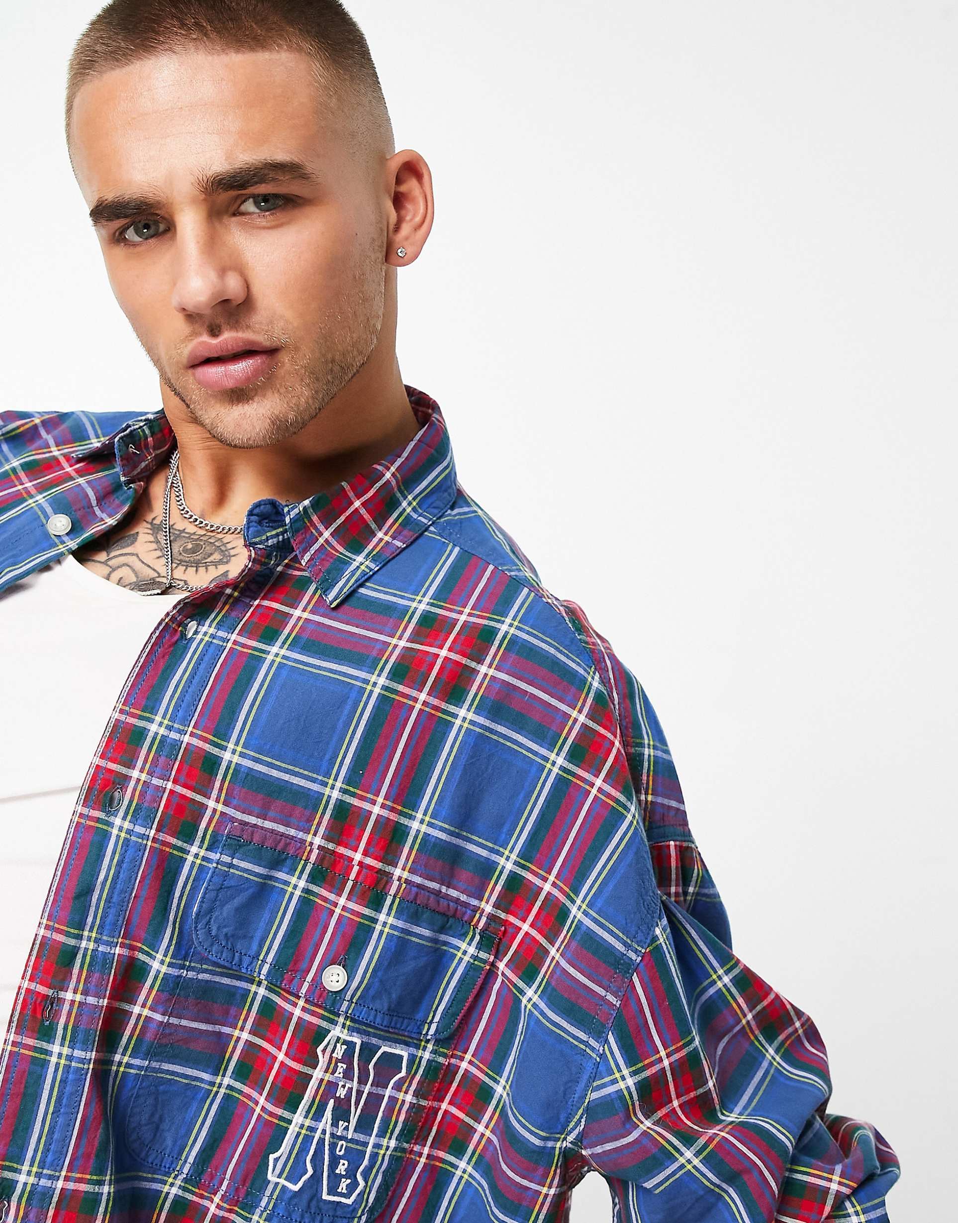 ASOS DESIGN oversized long-sleeved shirt in varsity check, featuring embroidered city name on the chest bold pattern and relaxed fit.