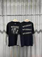 The House Brand BEETLEJUICE Double Stripe Sleeve T-Shirt is a black tee featuring a round neckline and distinctive double-striped sleeves. It showcases an embossed BEETLEJUICE print on both the chest and back, adding a bold touch to the design. This shirt offers a comfortable fit and a striking aesthetic, making it a standout piece for fans of the classic film.