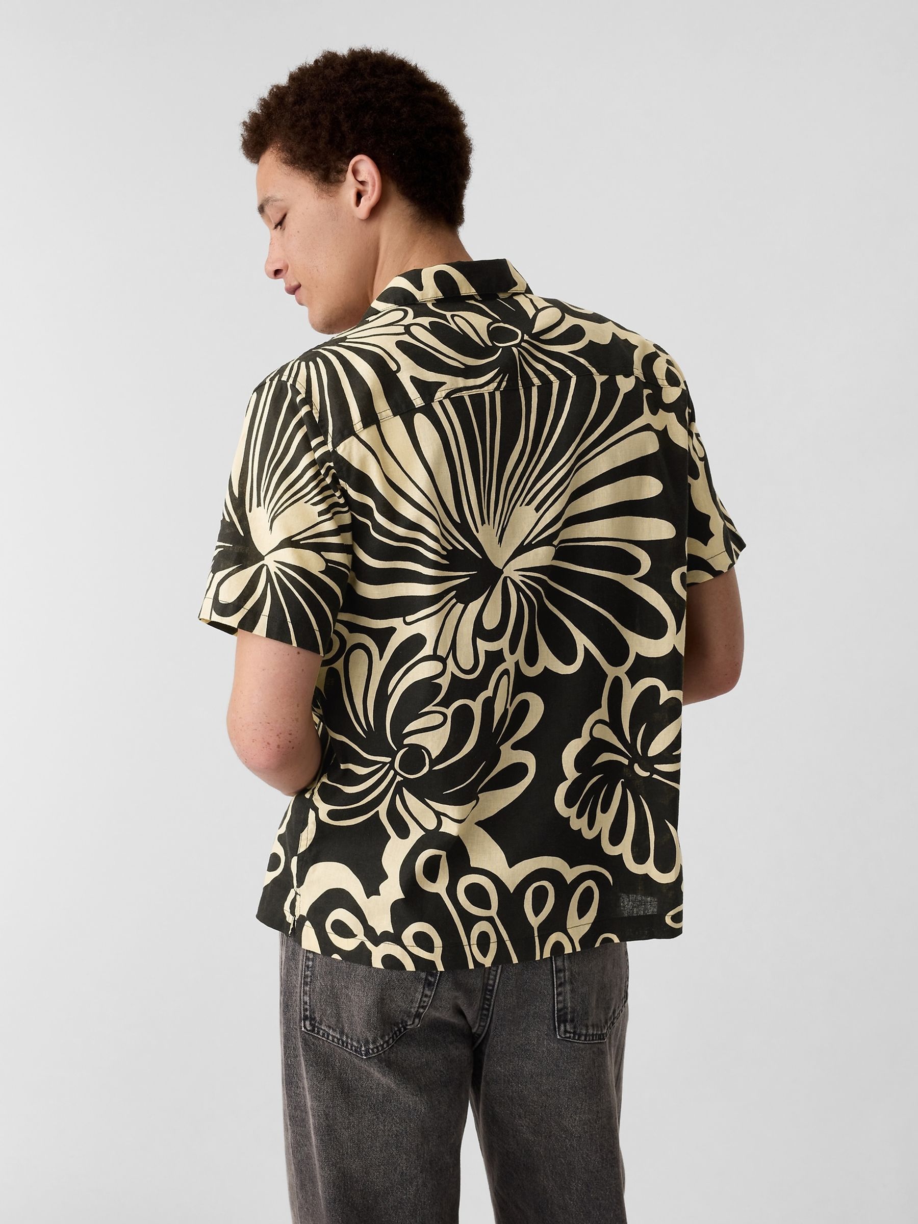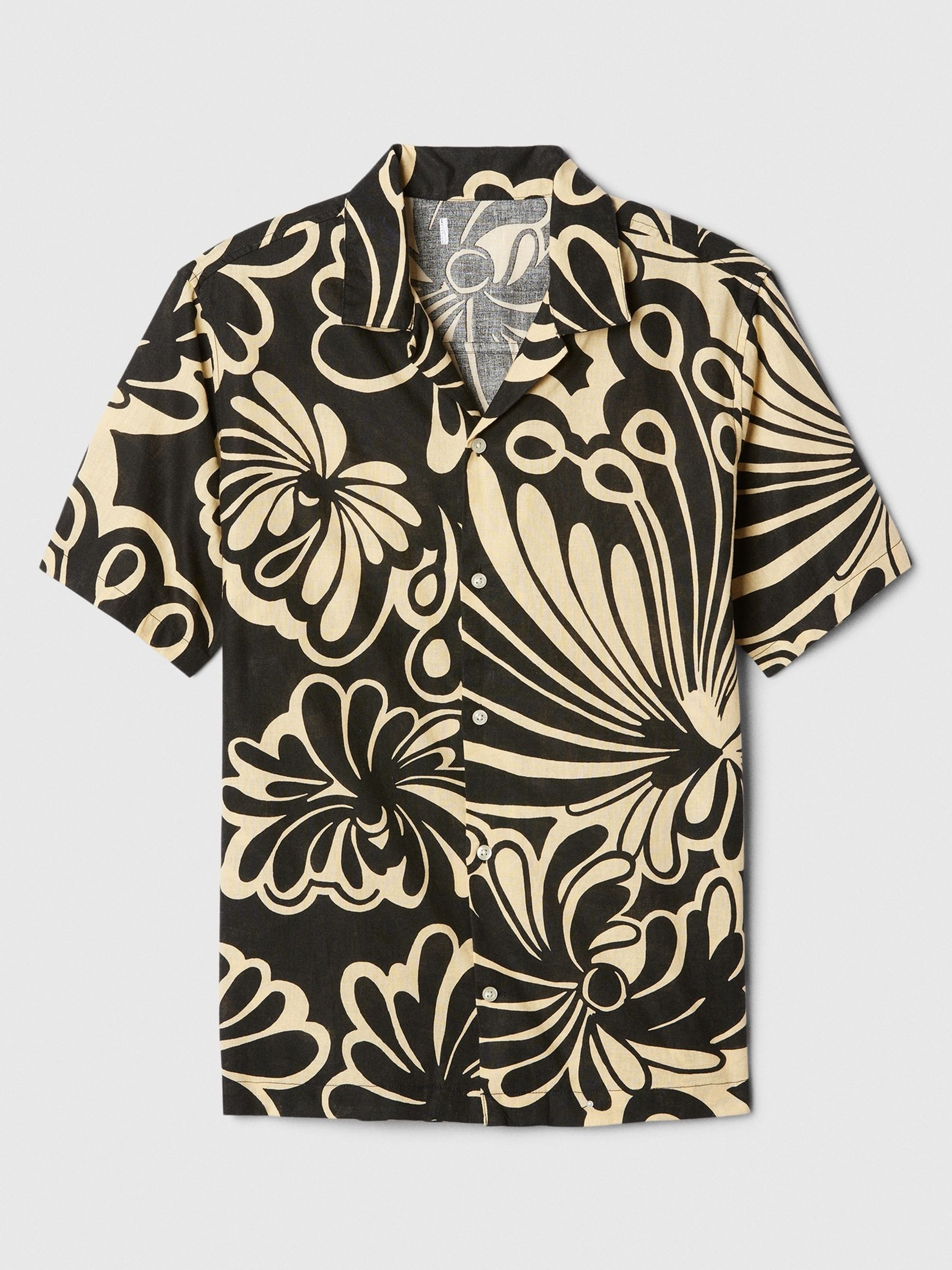 GAP Black Floral Linen Blend Regular Fit Short Sleeve Holiday Shirt