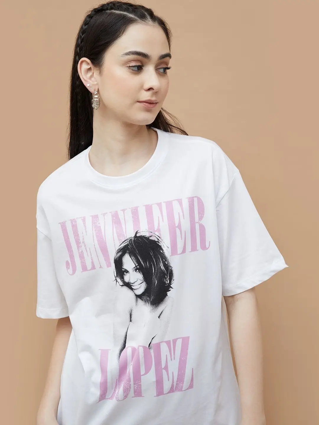 Show off your style with the Ginger by Lifestyle Jennifer Lopez White Printed T-Shirt. Made from 100% organic cotton, this tee delivers all-day comfort and breathability. The bold Jennifer Lopez print on the front adds a trendy and confident vibe, making it a standout piece for casual wear. Pair it with denim or shorts for a fresh, easygoing look that reflects your love for music and fashion.