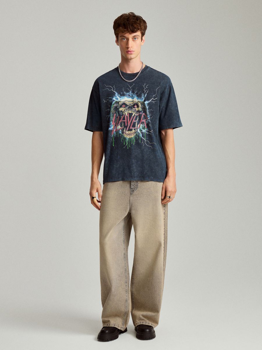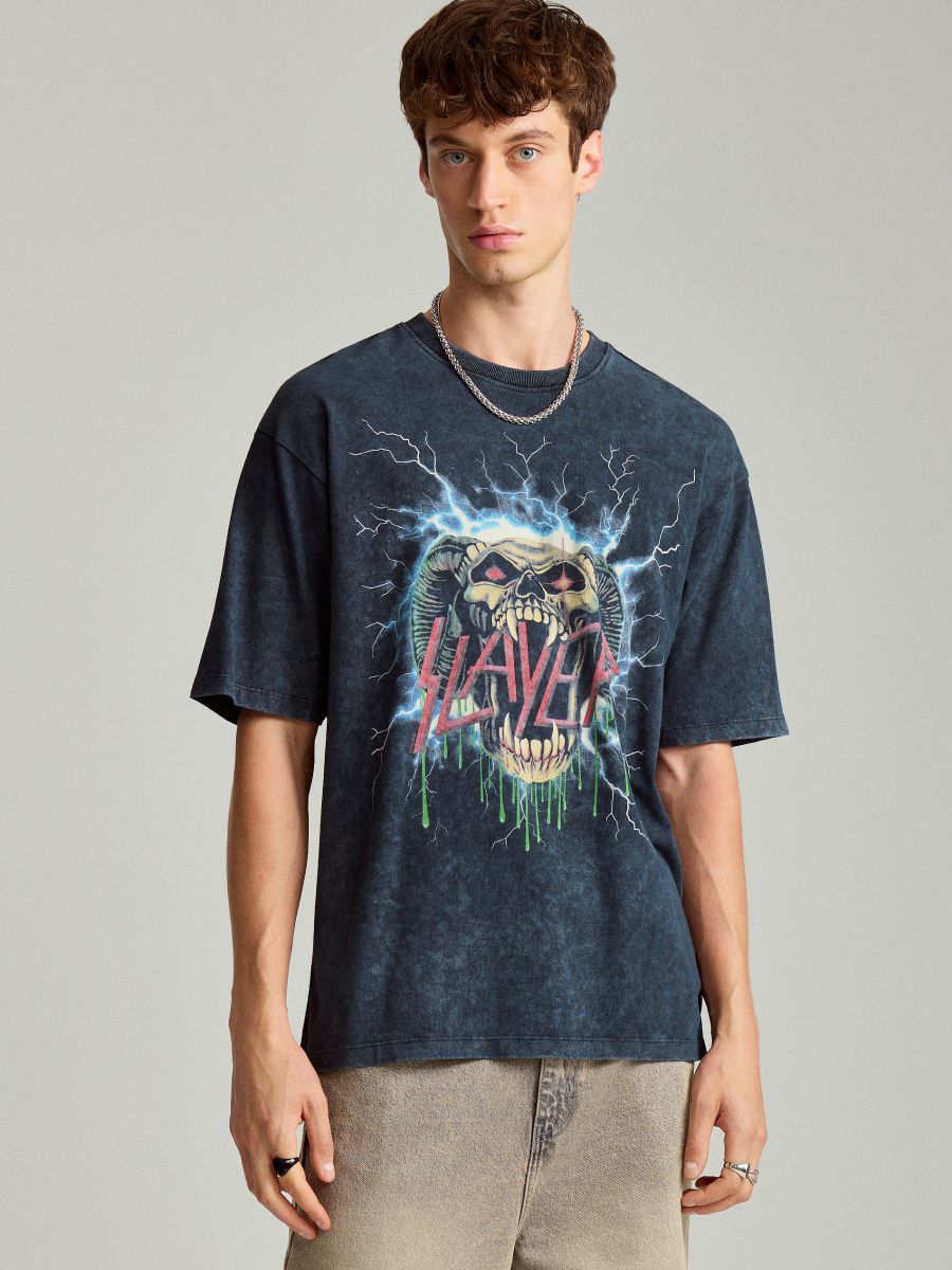 Turn up the attitude with this House brand Slayer loose-fit T-shirt. Featuring a powerful Slayer graphic, this tee delivers a strong, rebellious look inspired by classic metal culture. Made from soft, breathable cotton, the loose fit offers extra comfort and a relaxed silhouette. Easy to style with jeans, cargos, or layered outfits, it’s a must-have for Slayer fans and anyone into bold graphic streetwear.