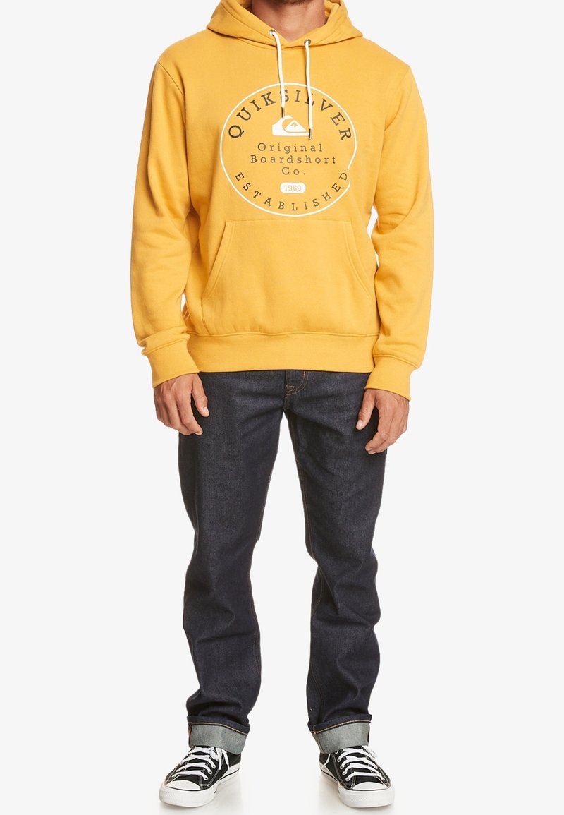 Men’s Quiksilver Circle Trim Hood Hoodie in yellow/mustard a casual pullover sweatshirt crafted from soft brushed fleece with a regular fit, hood with drawcords, kangaroo pocket, and subtle Quiksilver branding for everyday comfort and style