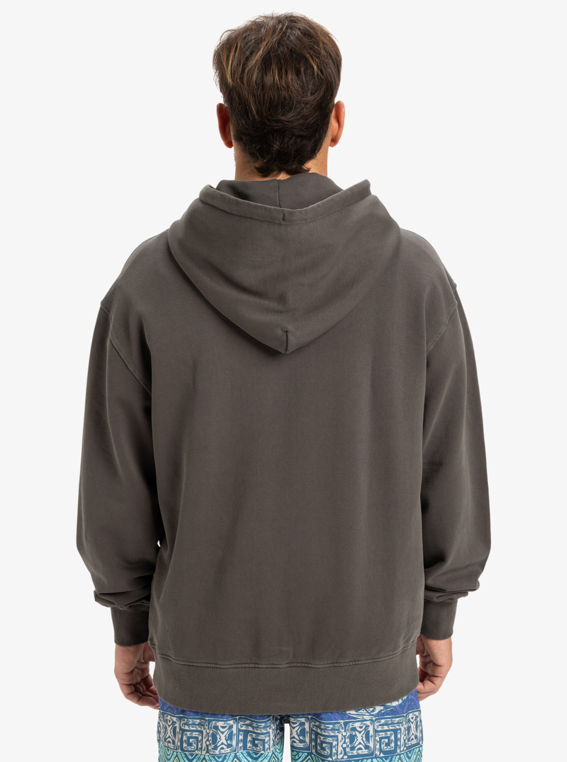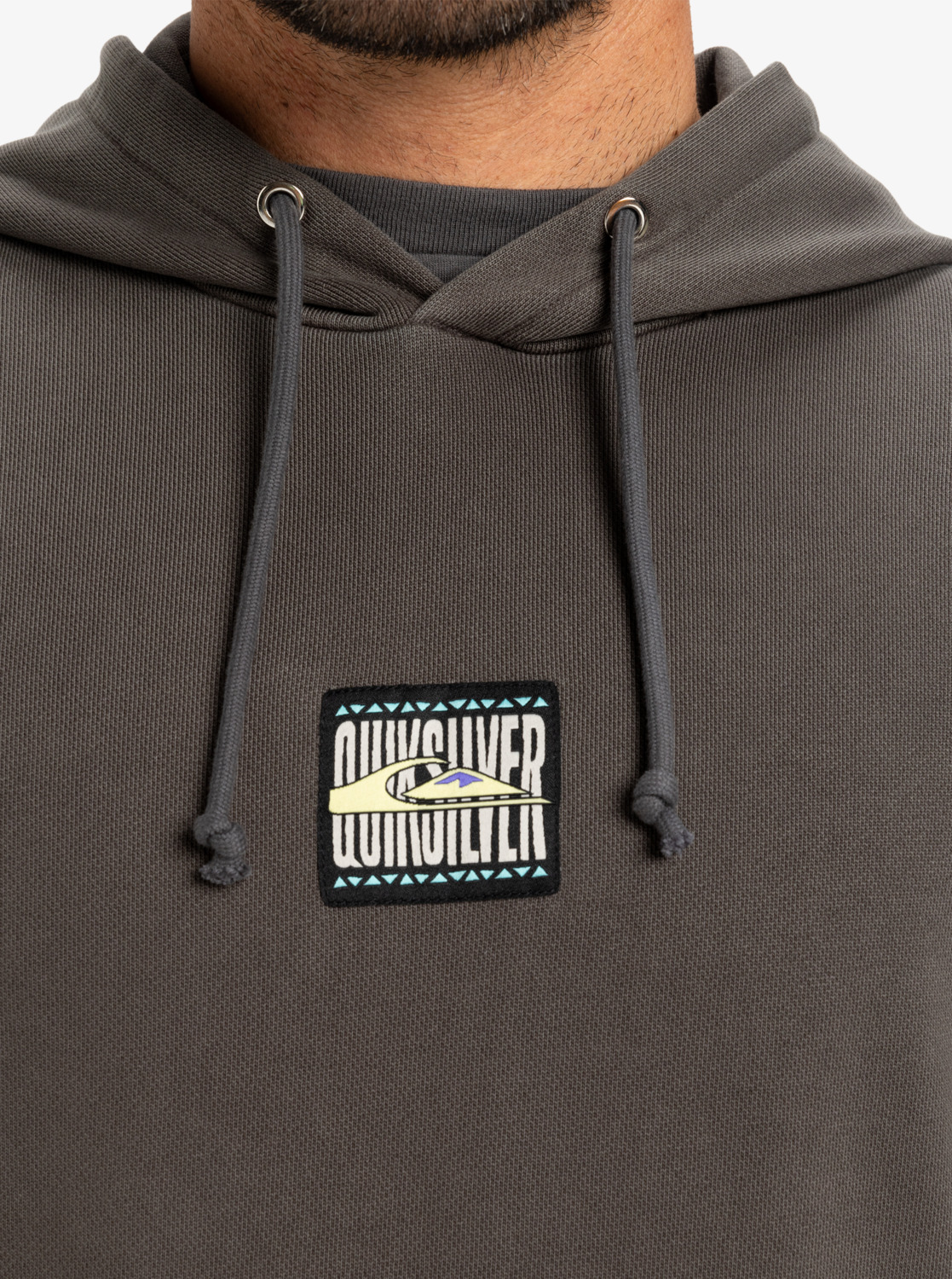 A relaxed oversized pullover hoodie in Dark Shadow made from soft organic cotton French terry with a vintage wash, kangaroo pocket, adjustable drawcord hood, ribbed trims, and a subtle Quiksilver chest badge perfect for everyday casual wear