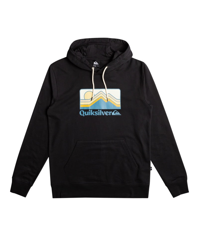 Men’s Quiksilver Gradient Mountains Hoodie in black a relaxed-fit pullover hoodie crafted from a soft cotton-polyester blend with a brushed interior, roomy kangaroo pocket, adjustable drawcord hood, and seasonal Quiksilver graphic at the chest. Comfortable and versatile for cool weather and everyday wear.