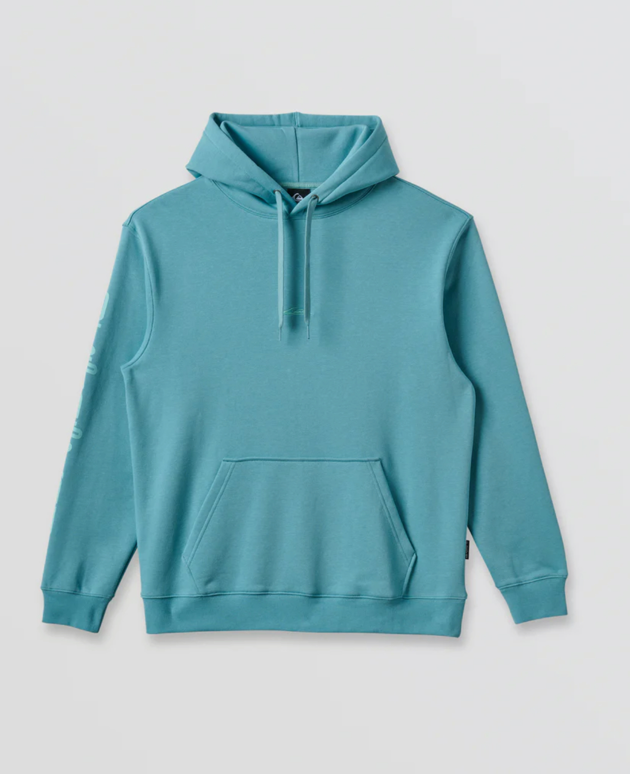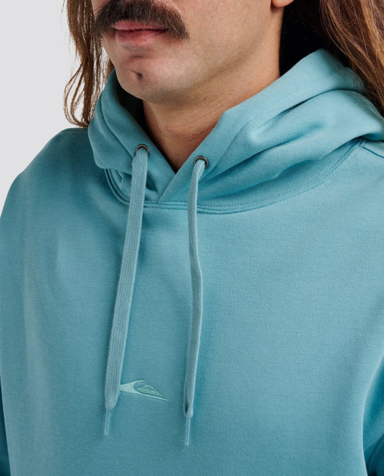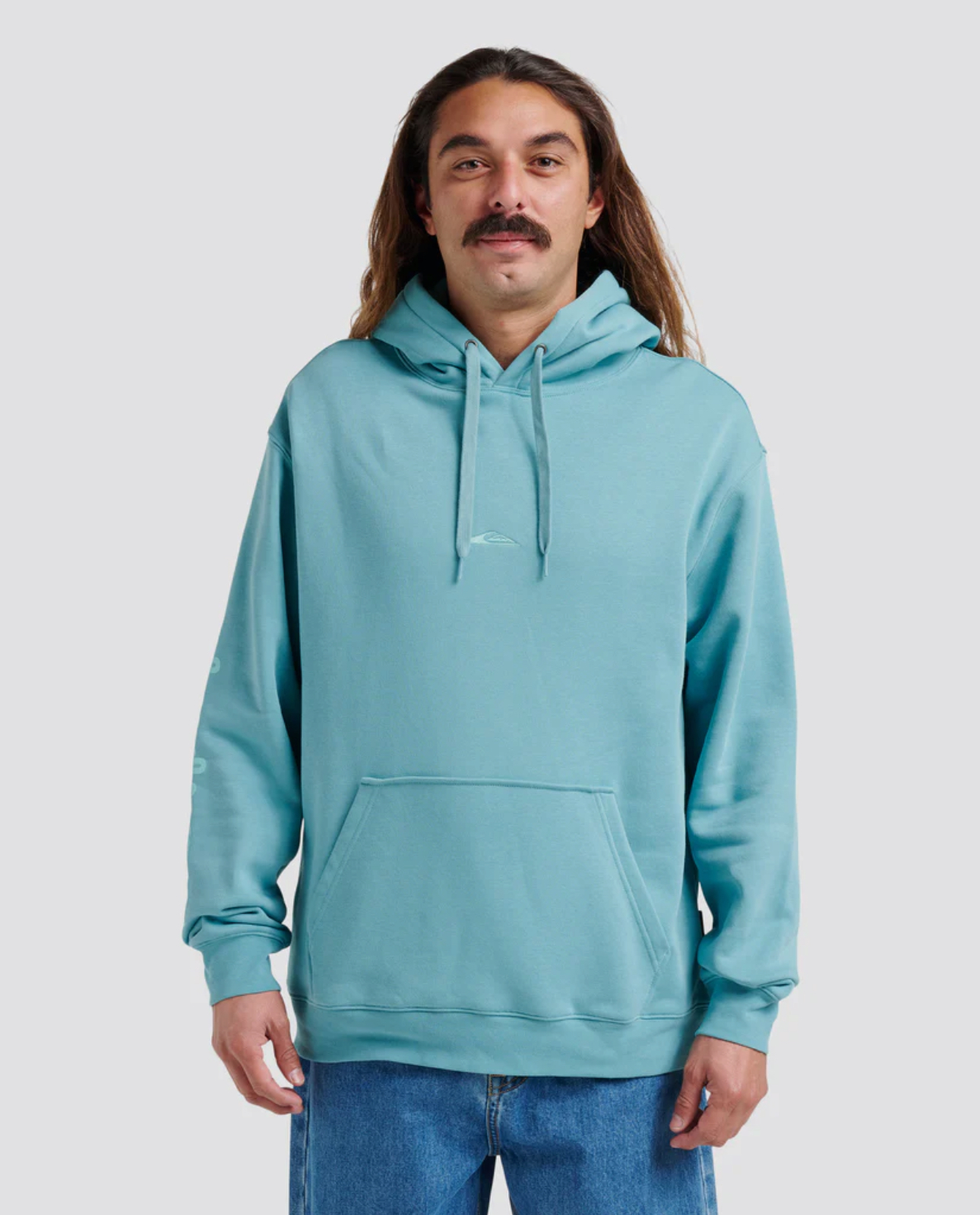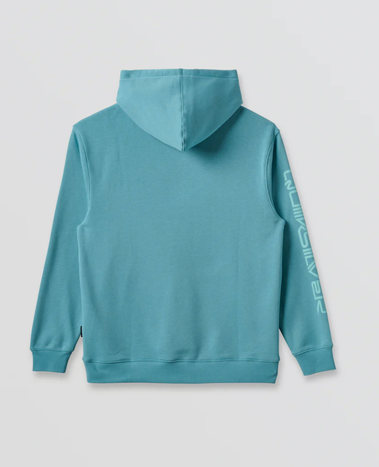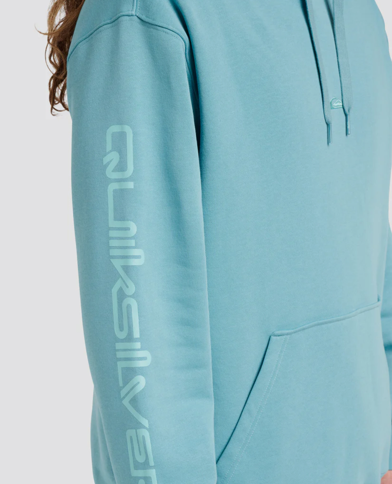 A classic regular‑fit pullover hoodie in Dusty Turquoise, crafted from soft brushed‑back fleece with an embroidered Quiksilver logo on the chest, printed branding on the sleeve, and a convenient pouch pocket perfect for casual wear.