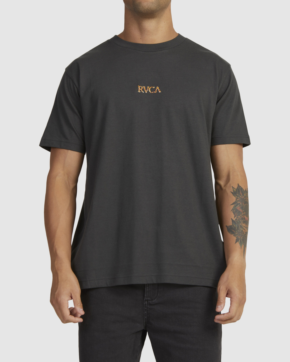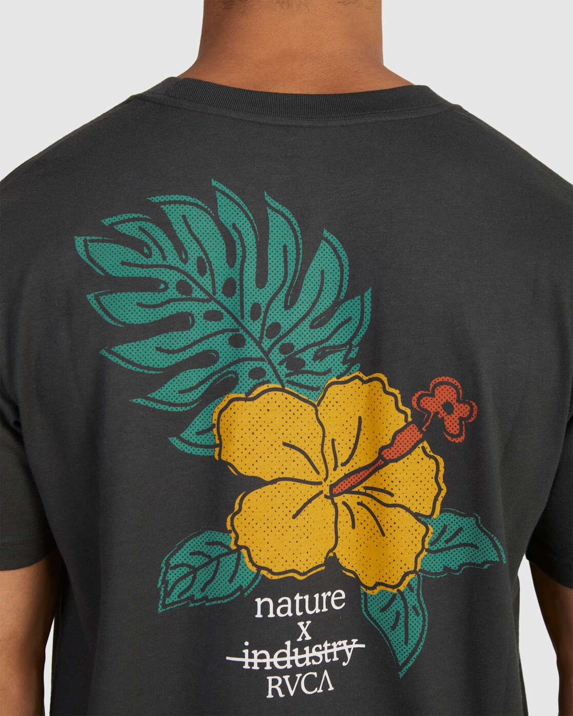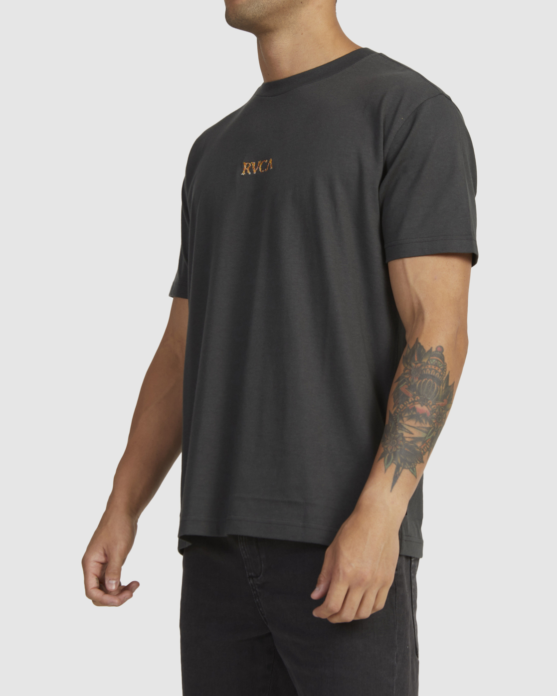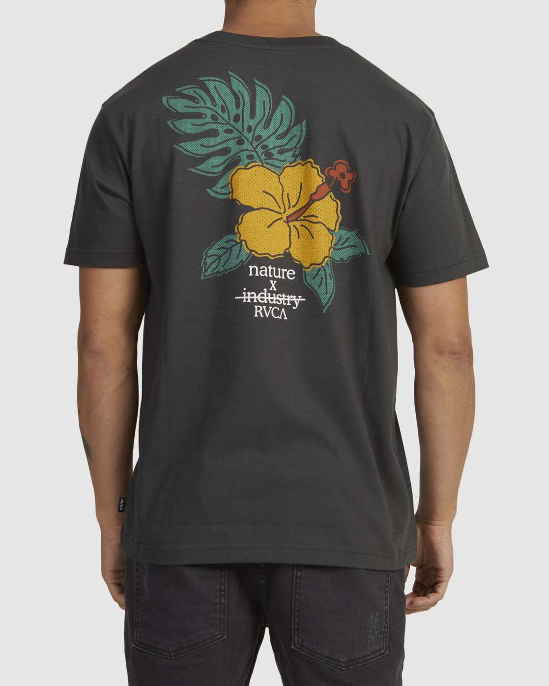Branding includes a small embroidered RVCA logo at the front chest and a large screen-printed design on the back for a graphic punch.