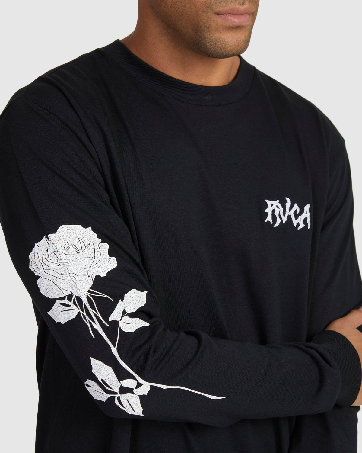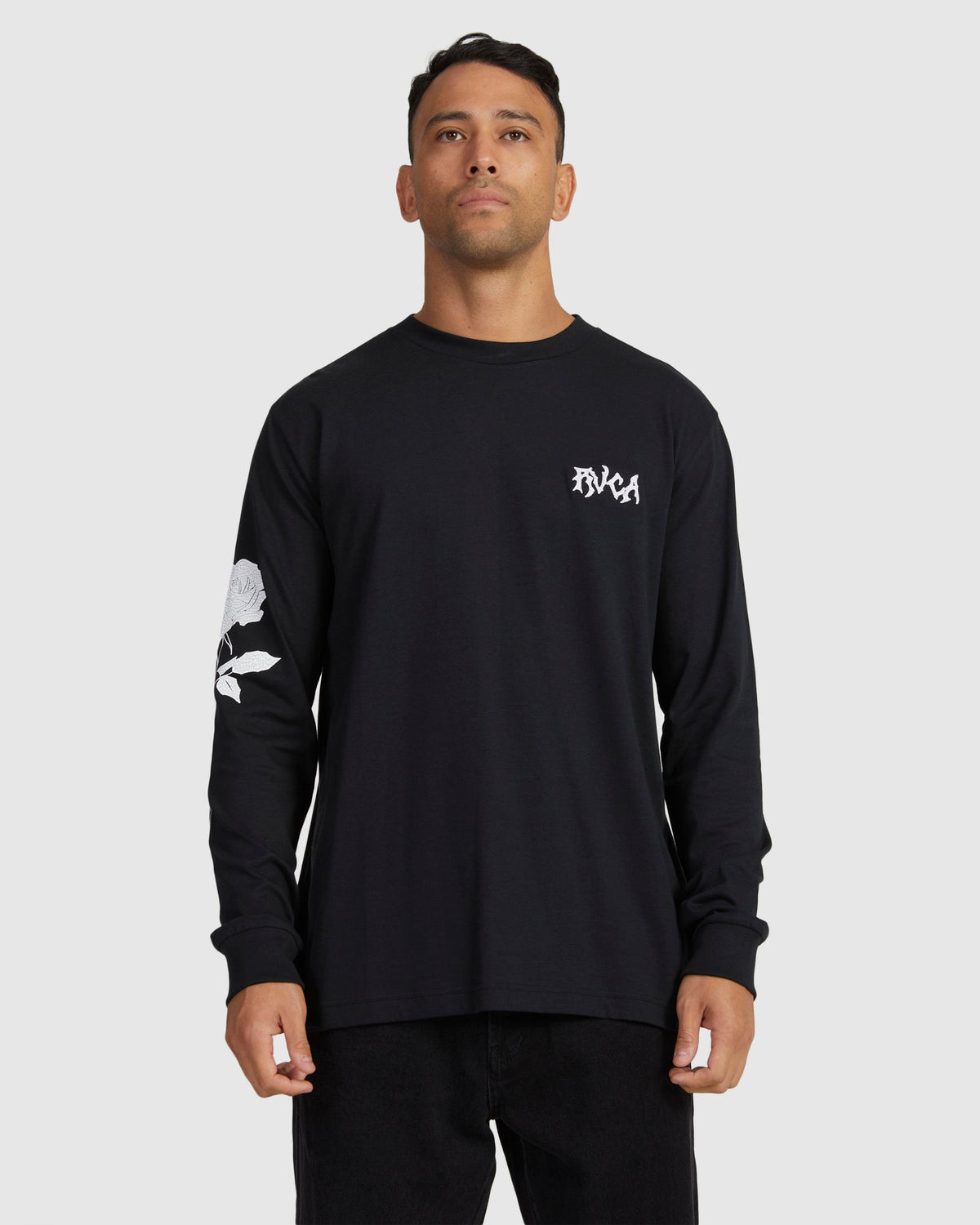 A relaxed‑fit long‑sleeve tee in classic black, featuring signature rose graphics on the arm and premium cotton construction ideal for elevated casual wear with edge.