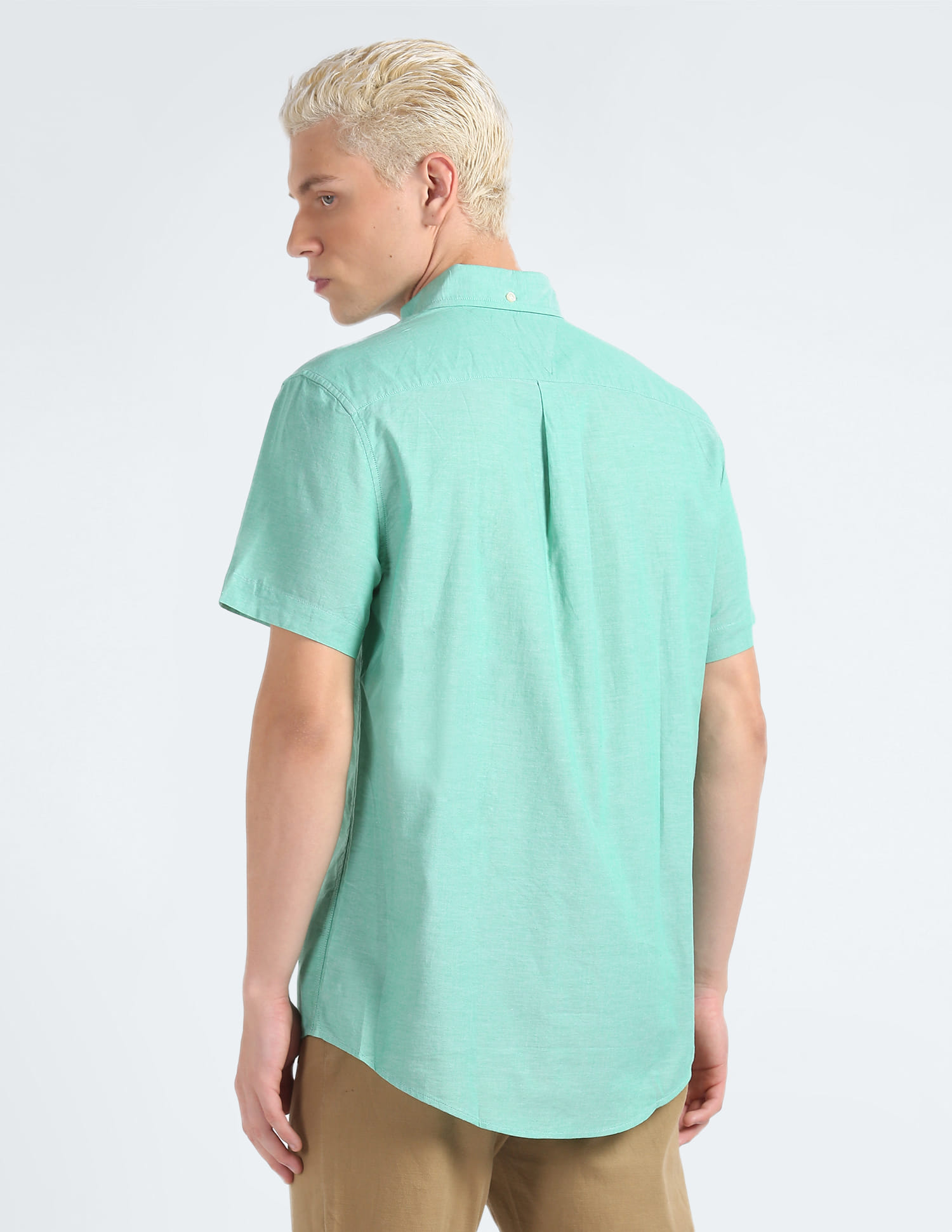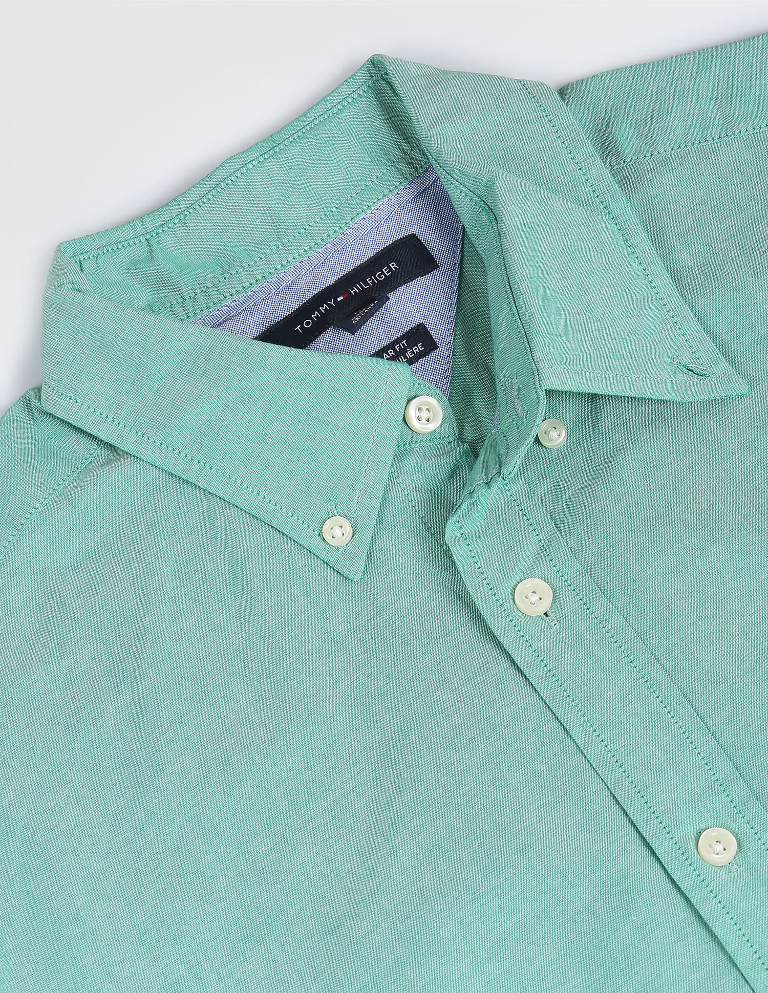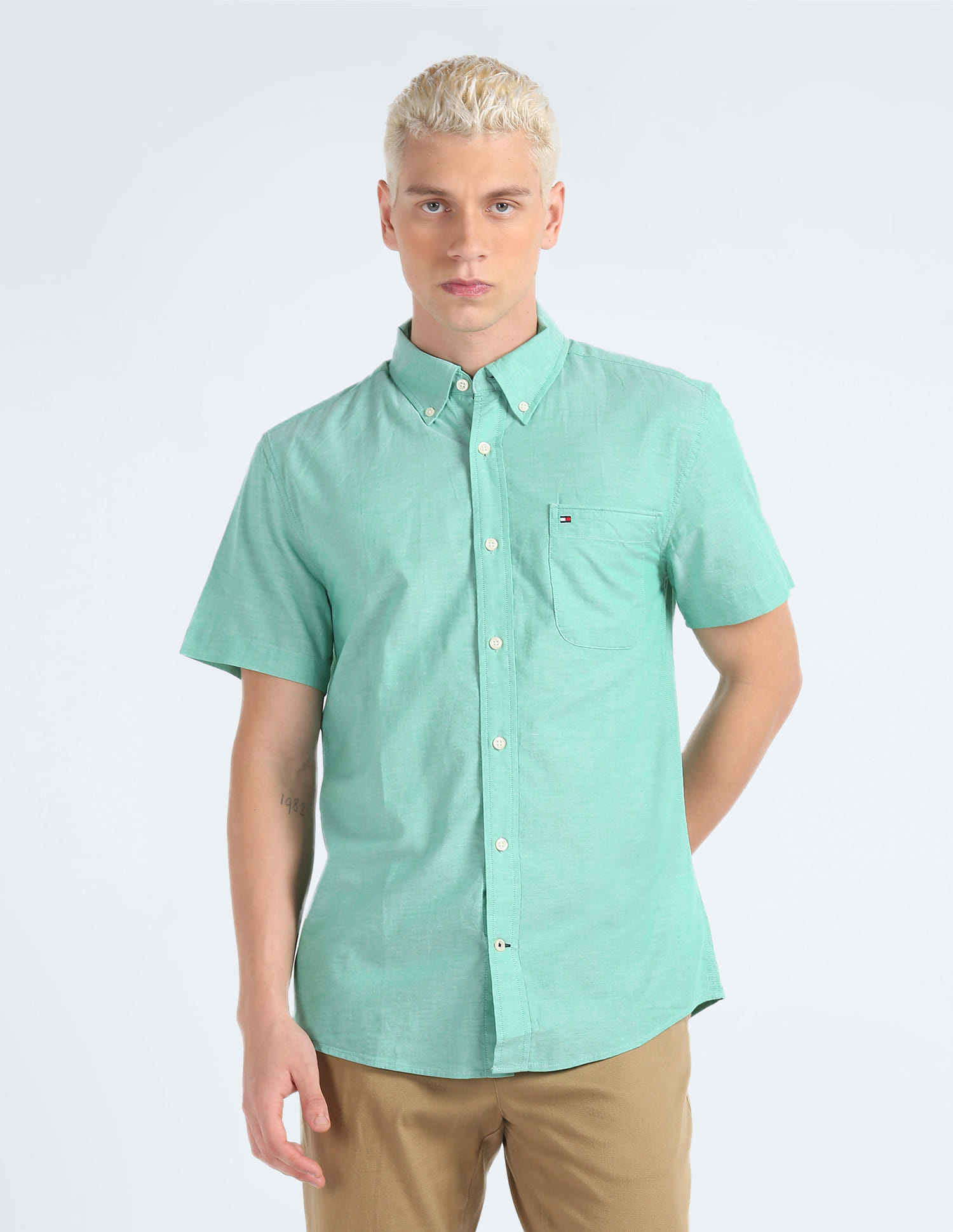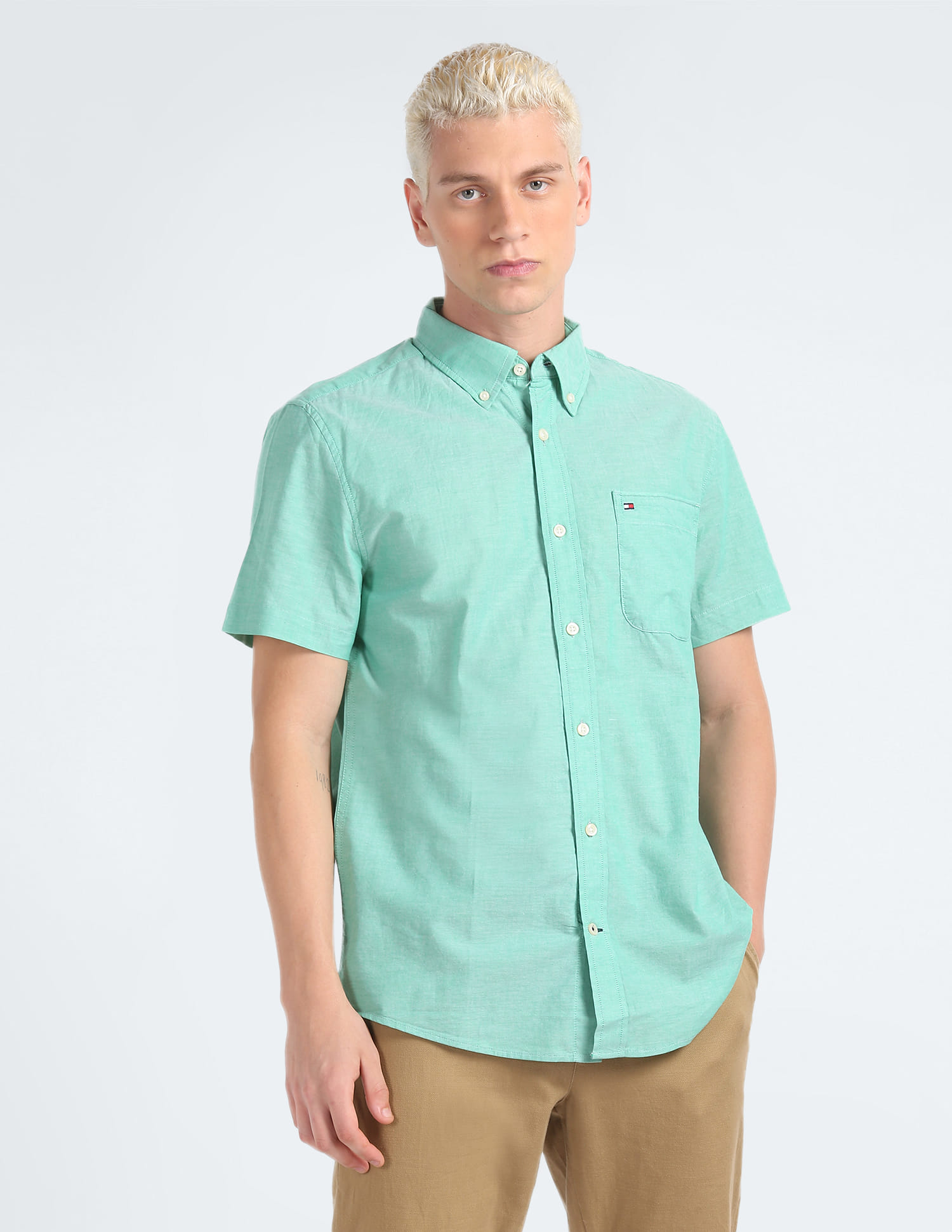 Finished with classic button-down styling and subtle Tommy Hilfiger branding, the light green shade adds a relaxed, clean look that pairs well with jeans, chinos, or shorts. Perfect for casual outings, smart-casual settings, or warm-weather days.